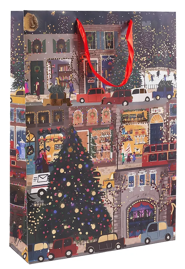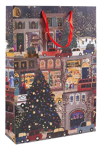 Новогодний бумажный пакет средней величины успешно вместит новогодний сюрприз. Зимняя картинка поднимет настроение и взрослым, и детям. А красные атласные ручки придадут оформлению подарка праздничности и солидности.