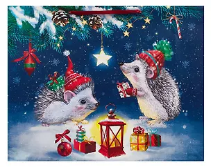 Прелестный новогодний пакетик, который был выбран мной под подарок большого размера - алмазную мозаику на холсте, которая помещается только в пакет такого объема. Купила именно этот пакет, так как он мне очень понравился своим милыми симпатичным внешним видом с изображением славных ежиков, которые меня подкупили😍. Пакет хорошего качества, сделан из плотного прочного картона, с крепкими ручками и надежным укрепленным дном. Изображение на пакете красочное и с оригинально поблескивающими элементами. Покупкой очень довольна, редко встретишь такой большой пакет в интересном оформлении. Советую!