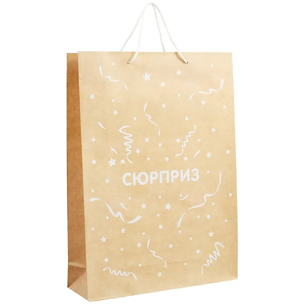 Отличный подарочный пакет: крафтовый, достаточно плотный и прочный, а также вместительный. Понравились простой рисунок и надпись - пакет в таком лаконичном дизайн просто деально подходит для упаковки подарка человеку любого пола и возраста, а также подходит для любого мероприятия. Порадовало качество ручек: хорошо зафиксированы, не выпали/вытянулись из отверстий. Осталась довольна покупкой, а именинник - оформлением подарка, ну и конечно же содержимым пакета. Однозначно рекомендую!