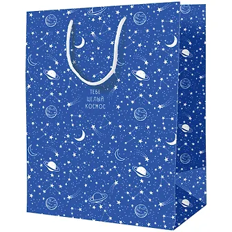 Очень красивый пакет с планетами и звёздами, выполненный в приятном фиолетовом и белом цвете. Идеально для подарка, причём сам пакет приличного размера, а именно формата листа А4, так что при желании в нем можно подарить довольно не маленькую вещь. И в преддверии праздников такой подарочный пакет будет однозначно очень кстати
