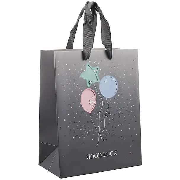 Пакет изготовлен из хорошего, плотного картона, практичный, не маркий, с надёжным дном. Склеен аккуратно, ничем не пахнет. Очень хорошие ручки, из крепкой, широкой текстильной ленты. Удобно нести, можно рассчитывать на большую нагрузку. Но вот визуально это не совсем то, что я ожидала. В реальности цвет какой-то мышиный, не каждому понравится, а рисунок – это даже не рисунок, а что-то вроде декупажа или аппликации. На месте воздушных шаров прорезаны фигурные отверстия, а с внутренней стороны вклеен небольшой лист картона, который эти отверстия закрывает. Я не поняла, для чего это сделано, эстетики не прибавляет. Но главное, что всё хорошо закреплено.