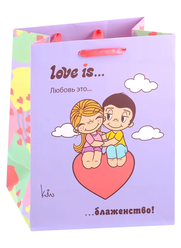 Замечательный подарочный пакет, выполнен из прочного и плотного материала, крепкие верёвки, отличная расцветка с яркими и сочными оттенками. Очень нравится принт с милыми героями из цикла love is... Такой подарочный пакет поднимет настроение и сделает подарок ещё приятнее.