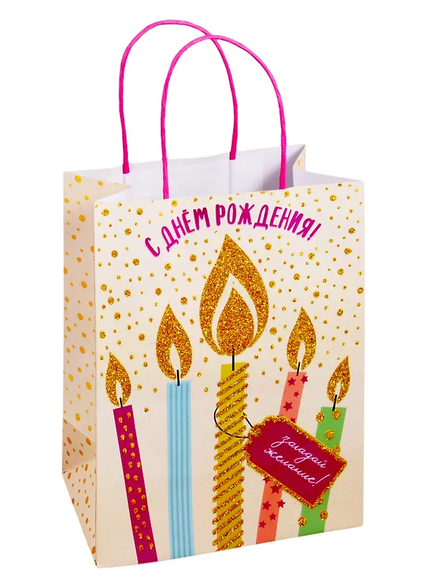Классный подарочный пакет ко дню Рождения. Яркий принт со свечками и соответствующим поздравлением. Цветные ручки. Сам пакет среднего размера, мой подарок туда точно поместится. Пакет пришёл без повреждений, все углы у пакета ровные, не рваные и не гнутые. Внутри пакет просто белого цвета