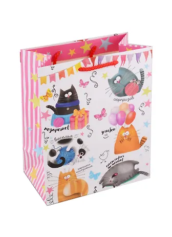 Данный товар приобретала для упаковки подарка на День рождения своему сыну, мне и ребёнку всё очень-очень понравилось) Выполнен максимально качественно: ручки крепкие, рисунок пропечатан ярко, чётко, поэтому по неосторожности не повредится. Оформление милое, яркое, красивое. Изображённые коты выглядят довольно-таки забавными.