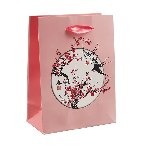 Небольшой пакет для компактного подарка. Оформление очень нежное, акварельное, в японской стилистике. Но цвета яркие, не блеклые, рисунок пропечатан хорошо, даже мелкие детали. Очень понравились ручки, которые сделаны в виде ленточек, а не веревочек, смотрится мило. Кстати, ручки довольно длинные, так что в пакет поместится и высокий, по сравнению с пакетом, подарок. Пакет чисто "женский", мужчине или ребенку такой дизайн, конечно же, не подойдет.