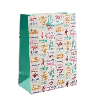 Небольшой и яркий пакетик, который вполне может заменить собой открытку. Его хочется разглядывать, стараясь прочитать все надписи, которые там есть. Пожелания, кстати, довольно мотивационные и не банальные. Такой пакет особенно подойдет для подарка человеку молодому, яркому, смелому и творческому, кто не боится трудностей, стремится многое узнать и получить от жизни как можно больше эмоций и впечатлений.