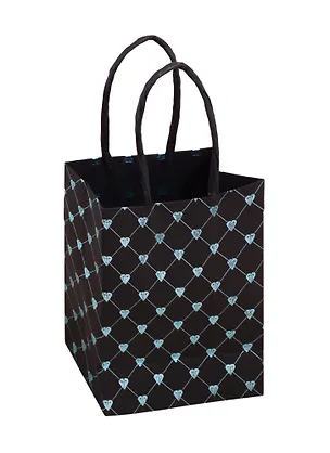Пакет очень понравился, полностью черный и внутри и снаружи. Выглядит очень стильно. Почему называется "голубые сердечки" не знаю, на рисунке в реальности - схематическое изображение бриллианта. Возможно, есть разные варианты принта) Ручки выполнены из скрученной бумаги тоже черного цвета, прочные на вид. Бумага пакета очень плотная. на дне пакета большая белая этикетка, но она в принципе легко снимается, следов не оставила. Покупкой довольна.