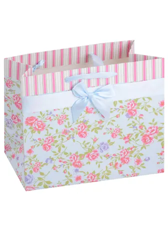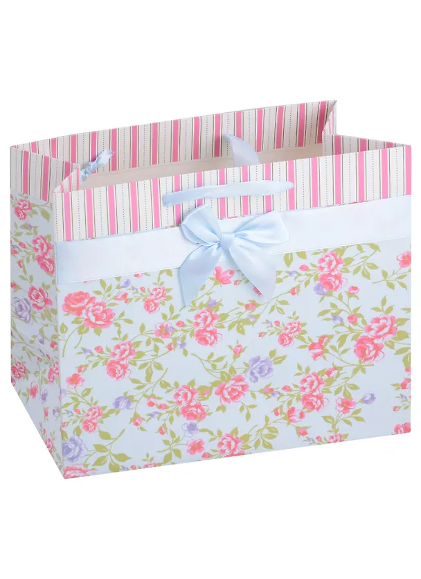 Потрясающий подарочный пакет с невероятно нежным принтом в виде цветов розы, приятные оттенки. Пакет выполнен из прочного и плотного материала, хорошо проклеен, надёжное дно, крепкие ручки. Очень понравилась, что пакет как бы вытянут в длину, горизонтальный, благодаря чему он идеален, например, для книг. Пакет средних размеров, но вместительный.