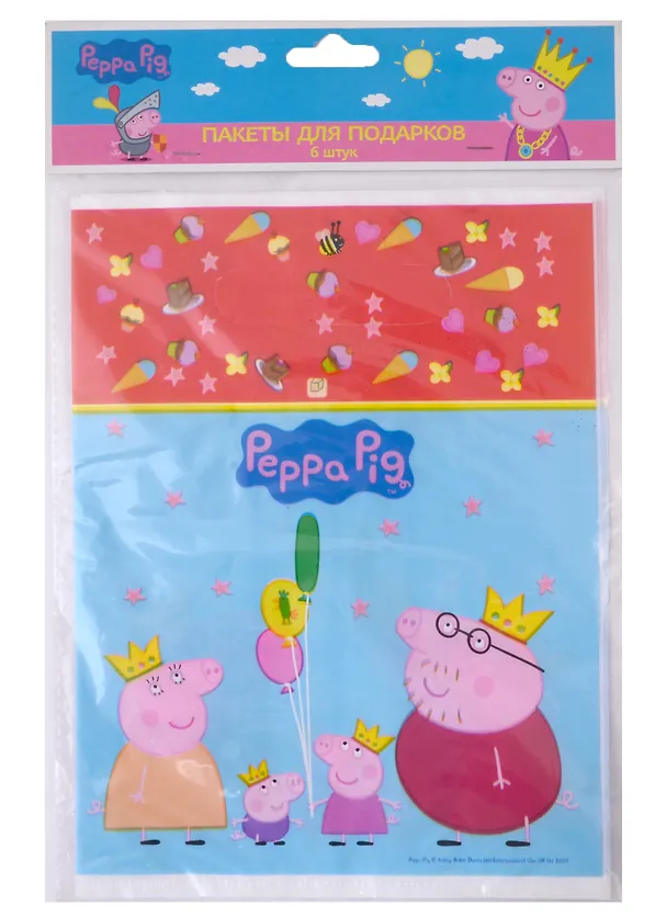 В наборе «Пеппа-принцесса» ТМ «Свинка Пеппа» 6 подарочных полиэтиленовых пакетов размером 17х23 см, декорированных ярким принтом.