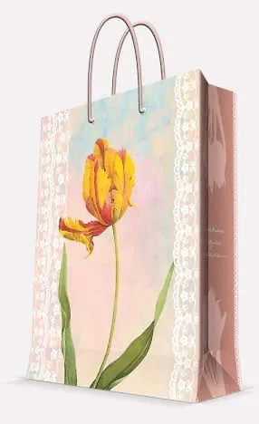 Бумажный подарочный пакет "ТЮЛЬПАН" размером 26*32,4*12,7 см изготовлен из плотной бумаги. Плотность бумаги 140 г/м2. Дно укреплено картоном, который позволяет сохранить форму пакета и исключает возможность деформации дна под тяжестью подарка. Пакет выполнен с глянцевой ламинацией, что придает ему прочность, а изображению - яркость и насыщенность цветов. Для удобной переноски имеются две ручки из шнурков.