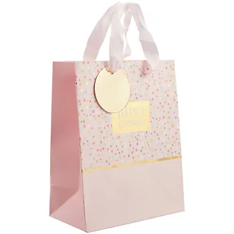Красивый праздничный пакет розового оттенка, с различными разноцветными вкраплениями. Посредине пакеты есть золотая надпись happy birthday, надпись красиво переливается на свету. Ручки пакеты сделанные из розовой атласные ленты нежного оттенка, на одно из ручек пакета есть специальная открытка шильдик, на которой можно написать пожелания или отправителя и получателя.