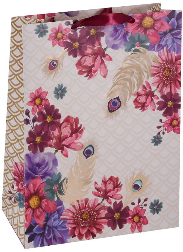 Смотрится красиво, изящно и нежно. Цвета насыщенные, приятные для глаз, печать чёткая. Бумага плотная, склеено всё аккуратно и ровно – нет никаких щелей, пятен, потёков и т.д, краешки подогнаны хорошо, не топорщатся, не задираются. На дно вклеен дополнительный слой бумаги для надёжности. Хорошие, удобные, крепкие ручки с пластиковыми заглушками, чтобы случайно не вылетели при нагрузке.
