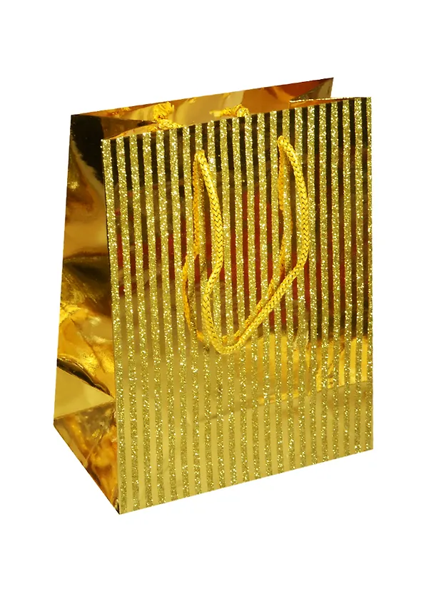Пакет подарочный бумажный А4 26*32*12 "Вертикальные полосы желтый металлик", нейтр., мат. ламинат, Хансибэг