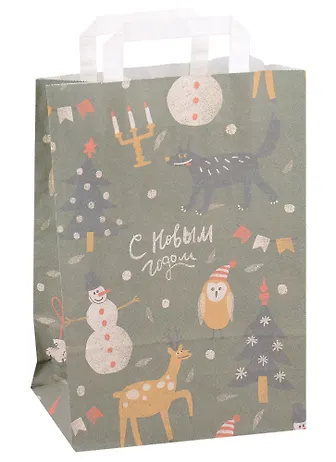 Пакет бумажный , не ламинированный. Рисунок матовый с новогодним рисунком. Не создает впечатлегния прочности. Тяжелое класть не советую. Зато создает праздничное настроение.