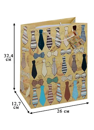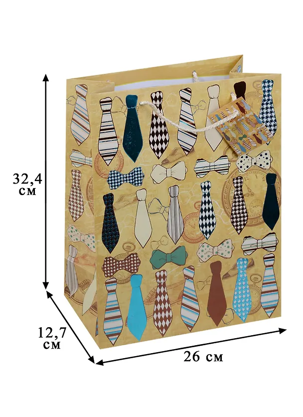 Бумажный подарочный пакет "Галстуки и бабочки" для сувенирной продукции размером 26*32,4*12,7 см, изготовлен из плотной бумаги. Плотность бумаги 250 г/м2. Дно укреплено картоном, который позволяет сохранить форму пакета и исключает возможность деформации дна под тяжестью подарка. Пакет выполнен с тиснением и глянцевой ламинацией, что придает ему прочность, а изображению - фактуру, яркость и насыщенность цветов. Для удобной переноски имеются две ручки из шнурков.