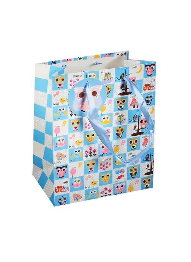 Пакет подарочный бумажный А5 18*23*10 "Совы. Owls", голубые квадраты, мат. ламинат, Хансибэг