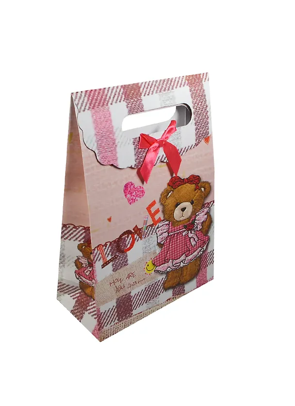 Пакет подарочный бумажный А5 19*8,5*27 "Мишка в платьице" на липучке, мат. ламинат, выруб. ручка, M