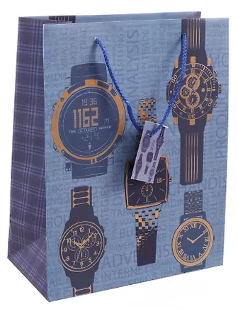 Бумажный подарочный пакет "Мужские часы" для сувенирной продукции размером 26*32,4*12,7 см, изготовлен из плотной бумаги. Плотность бумаги 250 г/м2. Дно укреплено картоном, который позволяет сохранить форму пакета и исключает возможность деформации дна под тяжестью подарка. Пакет выполнен с тиснением и глянцевой ламинацией, что придает ему прочность, а изображению - фактуру, яркость и насыщенность цветов. Для удобной переноски имеются две ручки из шнурков.