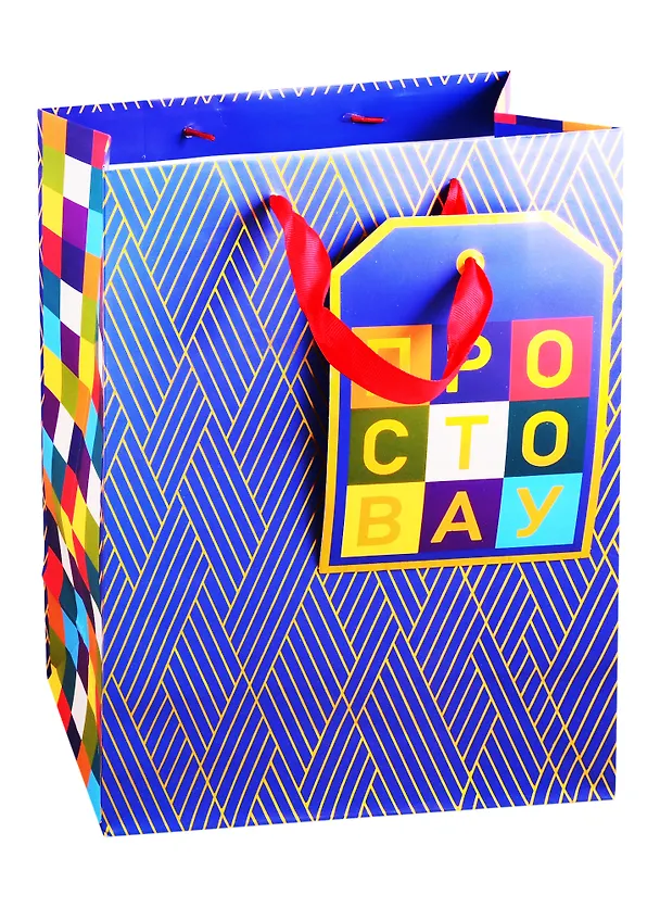 Красивый и большой праздничный упаковочный пакет, дизайн контрастный и яркий. Сам пакет подойдёт для довольно таки большого подарок, размер пакета 36 см на 27, примерно формат листа а четыре. Ручки у пакеты из красной ленты, на одной из ручек есть открытка синего цвета с разноцветными буквами «просто вау», зайти на английский можно написать свои пожелания имениннику.