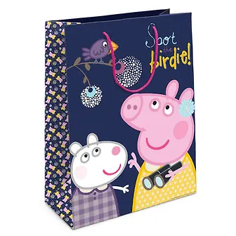 Подарочный бумажный пакет «Пеппа и птица» с очаровательным героями мультфильма «Свинка Пеппа» празднично украсит подарок и создаст отличное настроение. Размер: 35х25х9 см. В ассортименте вы также сможете найти такой же пакет размером 23х18х10 см.