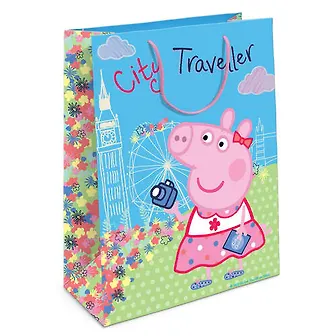 Подарочный бумажный пакет «Пеппа на каникулах» с веселыми и забавными героями мультфильма «Свинка Пеппа» очаровательно украсит подарок и обязательно порадует малыша. Размер: 35х25х9 см. В ассортименте вы также сможете найти такой же пакет размером 23х18х10 см.