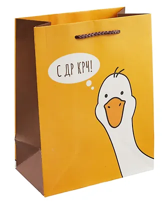 Мне нужно было найти интересный пакет для подарка молодой девушке , искала на других сайтах, но не нашла, а увидела этот, необычное оформление, со смешным гусем и надписью. Пакет удивил дарителя , для современной молодежи это самое то, и понятно и прикольно. Яркий цвет, привлекающий внимание.