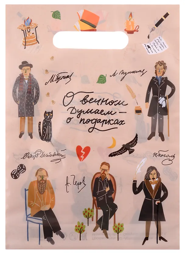 Пакетик небольшой, достаточно плотный, яркий, привлекает внимание, можно положить какую-нибудь небольшую вещицу. Хорош для ежедневного использования и в качестве упаковки подарка. Мне не хватило писателей и поэтов. Хорошо было бы, чтобы на оборотной стороне были другие классики. Это и для развития полезнее было, как детям, так и взрослым.
