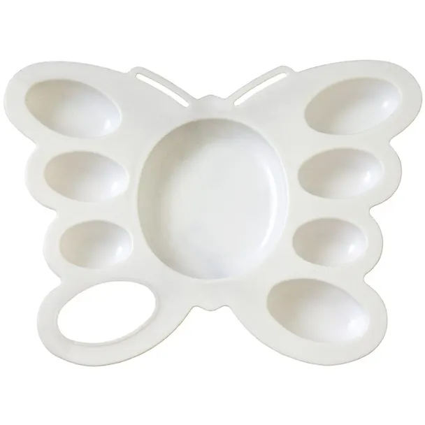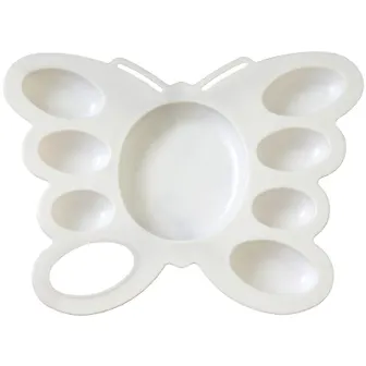 Очень милая палитра в виде бабочки. Имеет удобную форму, которую легко держать в руке, не тяжелая. Окрашена в приятный белый цвет, в котором хорошо видны смешиваемые цвета красок. Легко отмывается разу после использования. Ребенку очень нравится.