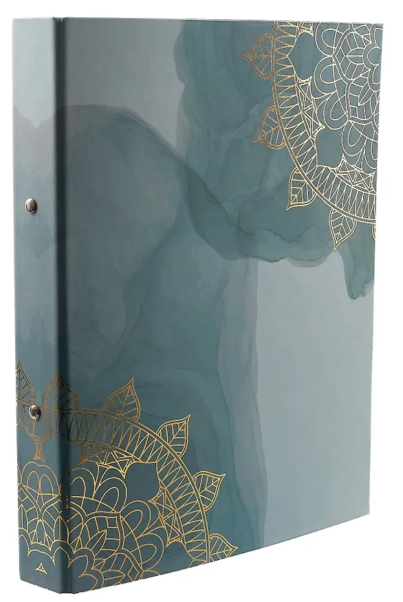 Расцветка, что мне пришла - нежная розовато-зеленовая, с золотыми полосочками. Внутри форзац белый, доп кармашков нет, механизм - 2 железных кольца.
