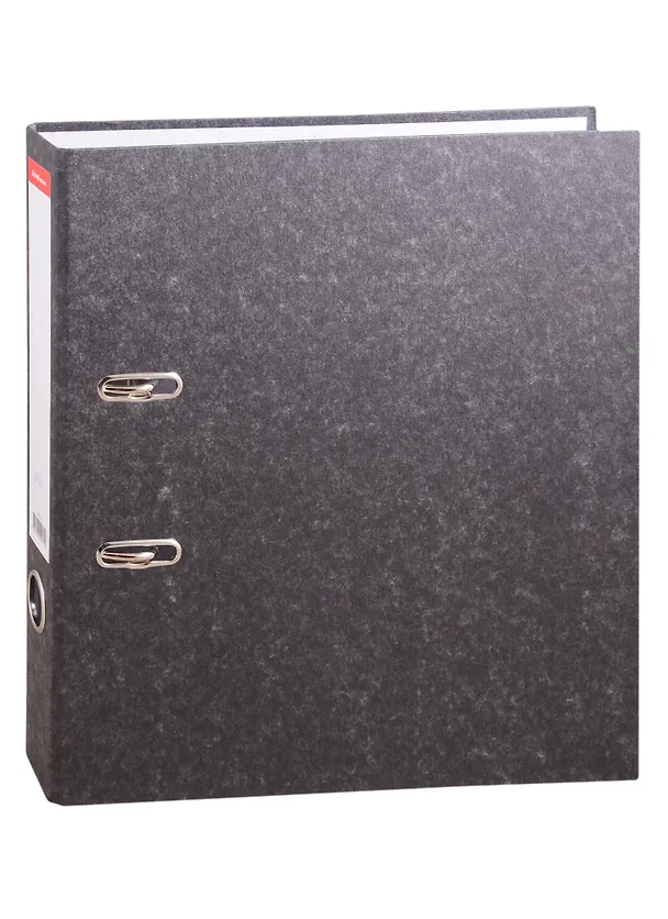 Папка - регистратор А4 снабжена стальным арочным механизмом с никелевым покрытием. Изготовлена из плотного картона толщиной 2 мм, покрытого износостойкой бумагой с фактурой «под мрамор» и водоотталкивающей поверхностью. На корешок шириной 50 мм наклеена этикетка для маркировки. Для удобства использования на корешке имеется металлическое кольцо для захвата. Металлические фиксаторы удерживают папку в закрытом виде даже при максимальном наполнении. Вместительность 350 листов бумаги плотности 80 г/м². На форзаце есть шаблон для оглавления.