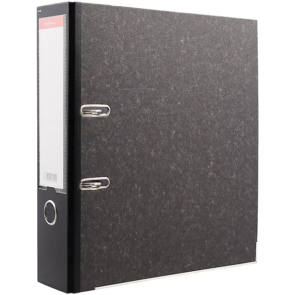 Папка - регистратор формата А4 снабжена стальным арочным механизмом с никелевым покрытием. Изготовлена из плотного картона толщиной 2 мм, покрытого износостойкой бумагой с фактурой «под мрамор» и водоотталкивающей поверхностью. Корешок папки шириной 70 мм оснащен прозрачным пластиковым карманом со сменной этикеткой для маркировки. Для удобства использования на корешке имеется металлическое кольцо для захвата. Нижние края обложки защищены металлическим кантом. Металлические фиксаторы удерживают папку в закрытом виде даже при максимальном наполнении. Вместительность до 450 листов бумаги плотности 80 г/м². На форзаце есть шаблон для оглавления. Цветные корешки папок позволят систематизировать д