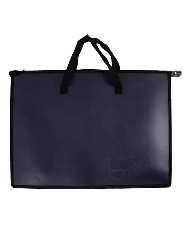 Рекомендую к покупке. Когда мне понадобилась папка для чертежей размером А3, то я выбрала эту папку. Благодаря ей документы и чертежи не по мнутся. Универсальная папка чёрного цвета без всяких рисунков только с надписью "Всё или ничего"  по английски. Ручки крепкие, не рвутся. В папку вмещается много листов А3, а также набор карандашей, ластик, линейки и другие принадлежности для черчения.