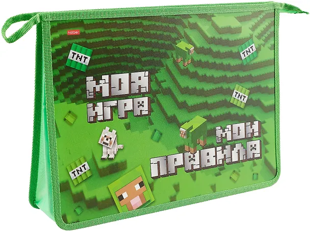 Очень удобная симпатичная папка! Застежка работает хорошо, не заедает. Ребенок носит в ней тетради и учебники по английскому языку. Красивый рисунок, понравится поклонникам Майнкрафт. Есть дополнительный кармашек, куда можно положить ручку, карандаш и т.д.