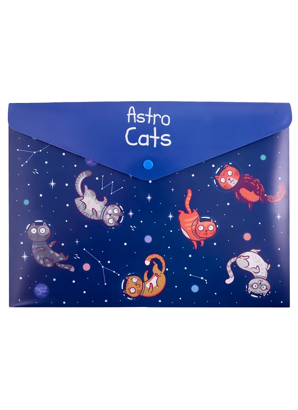 Папка не очень плотная, но все равно сохраняет документы от заломов и загрязнений, застегивается надежно на кнопку. Можно дать ребенку в школу, можно хранить документы дома, можно веселить коллег на работе смешными космическими котами. Цвет насыщенный синий, запаха никакого не почувствовала.