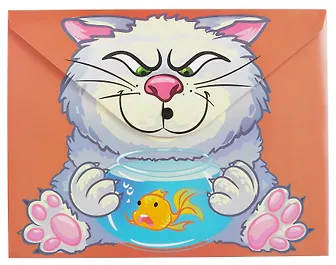 Папка на кнопке пришла в отличном состоянии. Была упакована в плёнку. Отсутствие каких-либо запахов. Яркий, чёткий и прикольный рисунок кота очень понравился. В разных положениях папки ( открытая/закрытая) меняется сюжет картинки, что вызывает интерес у ребёнка, создавая элемент игры. Формат папки А4 отлично подойдёт для бумаг и документов. К покупке очень рекомендую.