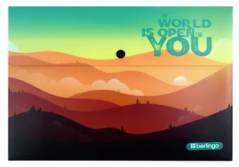 Папка с мотивирующей надписью на иностранном языке , означающей- мир открыт для Вас. Сочные яркие цвета от зелёного и жёлтого до оранжевого, терракотового с оттенком бронзы. Внутри папка - белая. Очень красиво исполнено.