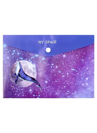 Фиолетовая непрозрачная, матовая папка формата А5 с изображением кита и луны на лицевой стороне, и звёздной Вселенной на обороте. Интересная задумка рисунка- луна и кит, в данном случае нашла свою реализацию на пластиковой папке. Этот сюжет популярен и для тетрадей, и даже для сумок- шопперов. Так что может получиться стильный комплект. Содержимое папки, документы, бумаги,- не просвечивает. Эстетически интересная творческая креативная папка.