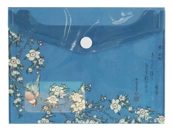 Папка красивого цвета с изображением японской гравюры. В реальности цвет темнее и более насыщенный. На оборотной стороне есть напечатанное окошко со штрихкодом (оно просматривается на фото в описании) и информацией о производителе, что портит эстетическое впечатление (наклейка, которую можно снять, была бы лучшим вариантом). Папка небольшая, аккуратная, идеальна для маленьких документов.