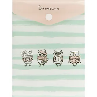 Папку украшают яркие изображения четырёх совушек в разных нарядах. Только посмотрите, какие они милые!