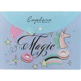 Цветую папку украшает милый единорог, сладости, звёздочки и цветы.