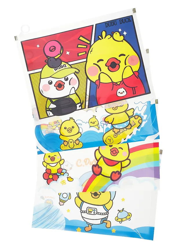 Весёлый рисунок с утками и ассорти расцветок поднимают настроение и помогают быстро узнать свою папку среди чужих. Подойдёт школьникам, студентам и всем, кто любит порядок в бумагах и яркие, заметные аксессуары.