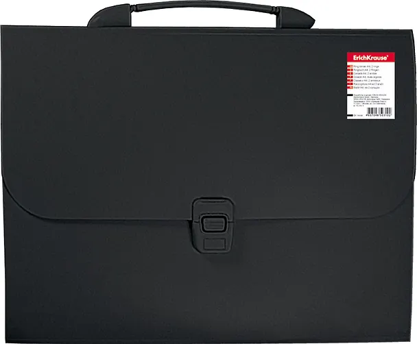 Портфель формата А4 из высококачественного пластика с текстурой поверхности "песок", на которой не видно отпечатков пальцев и мелких царапин. Предназначен для транспортировки документов. Цвет портфеля - черный. Портфель вмещает до 350 бумажных листов. 12 внутренних отделений позволяют сортировать документы по темам. Оснащен фирменным замком и ручкой с логотипом ErichKrause®. Размер - 335х230х35мм, толщина - 0.6мм.