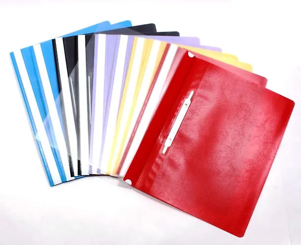 Изготовлена из полупрозрачного, прочного пластика, имеет прозрачный верхний лист и более плотный нижний. Папка оснащена металлическими скобками для фиксации перфорированных бумаг. В комплект входят 10 папок формата A4.