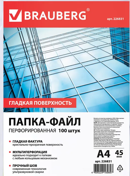 Перфорированные папки-файлы BRAUBERG предназначены для хранения документов и подходят для подшивки в папки с любым кольцевым механизмом и скоросшивателем.