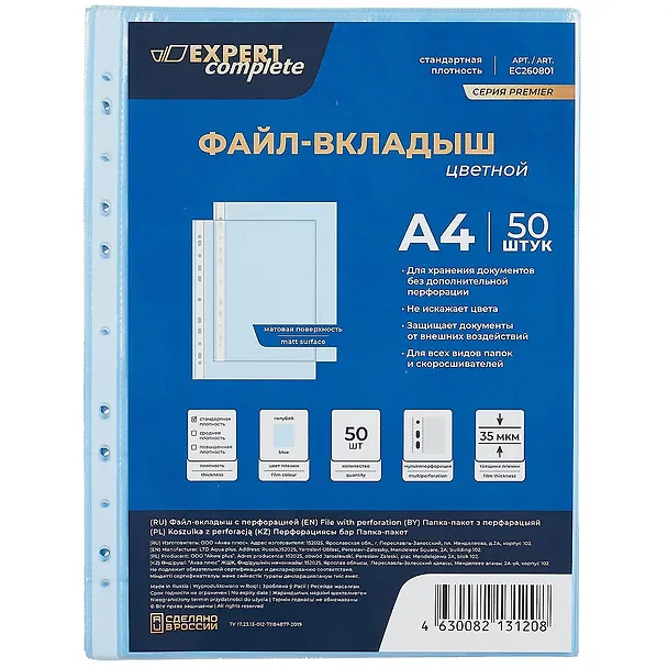 Папка-вкладыш А4 50шт/уп 35мкм, голубая