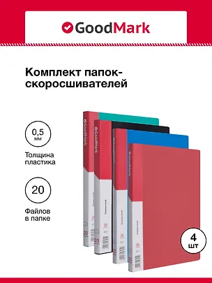 Комплект из четырёх папок GoodMark с файлами точно пригодится в университете, школе и офисе.