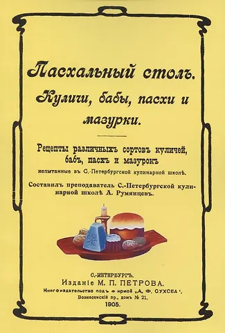 Репринт с издания. Санкт-Петербург. М. П. Петров, 1905. Сборник редких старинных рецептов, проверенных в С.-Петербургской кулинарной школе. Составил преподаватель С.-Петербургской кулинарной школы А. Румянцев.