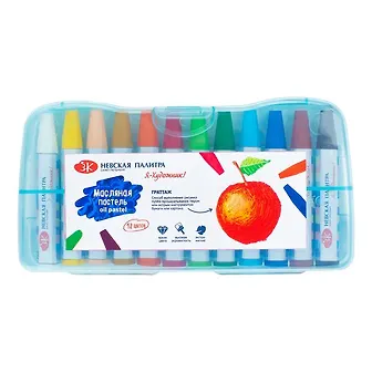 В отличие от сухой масляная пастель ярче, при работе не крошится, не содержит вредных примесей (безопасна для детского творчества). С ее помощью можно получать плавные цветовые переходы. После нанесения рисунок устойчив к выцветанию. Подходит для создания интересных художественных эффектов. Состав: белый, жёлтый, телесный, охра, оранжевый, красный, светло-зелёный, тёмно-зелёный, голубой, синий, коричневый, чёрный.