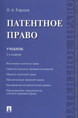 В учебнике систематизированы и освещены действующие положения законодательства Российской Федерации, регулирующего отношения в сфере правовой охраны и использования изобретений, полезных моделей, промышленных образцов и селекционных достижений. Подробно рассматриваются и анализируются как материально-правовые, так и процедурные нормы патентного права. Учебный материал, содержащийся в представленном издании, ориентирован на углубление профессиональных знаний студентов юридических вузов, освоивших общий курс гражданского права, и по стилю изложения близок к монографическим текстам. Законодательство приводится по состоянию на сентябрь 2016 г. Учебник может быть полезен не только студентам, но и