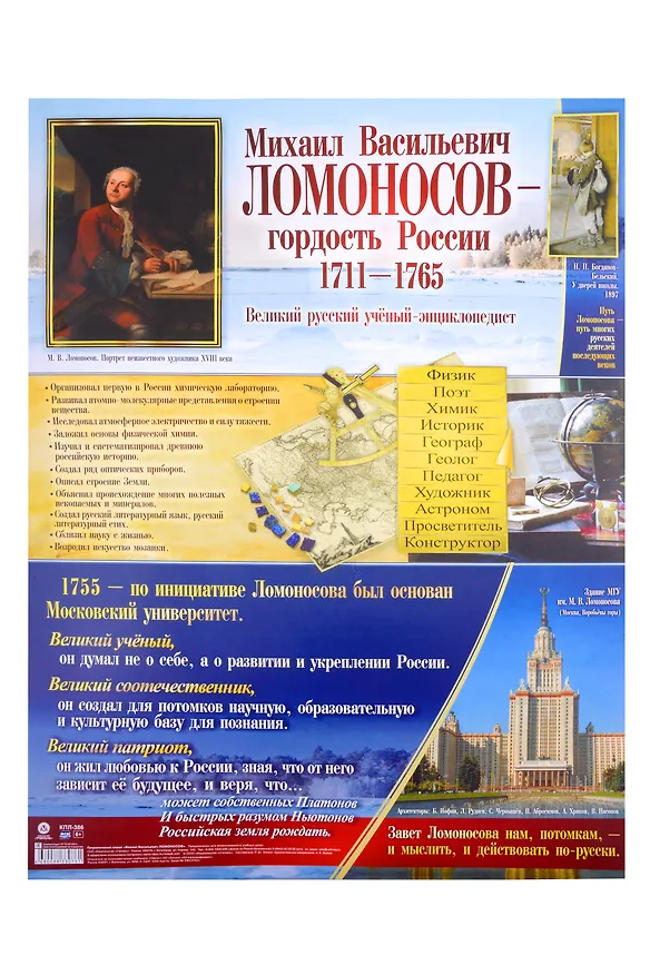 Плакат посвящен великому русскому учёному-энциклопедисту мирового значения М. В. Ломоносову, первому русскому академику, универсальному гению, открытия которого опередили мировую науку на несколько столетий. Плакат адресован школьникам для привлечения их внимания к имени и заслугам выдающегося русского ученого, уникального самородка, патриота, для пробуждения чувства гордости за великого соотечественника, будет полезен педагогам как обучающий и воспитывающий ресурс при изучении уроков (литературы, химии, физики и др.), тематически связанных с деятельностью М. В. Ломоносова, а также классным руководителям, педагогам дополнительного образования, организаторам внеклассной и внеурочной деятельно